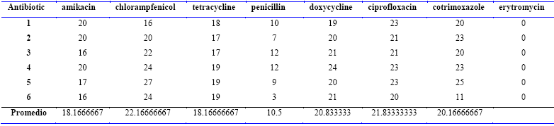 García Rodríguez et al.23 expose in a previous work, the standard patterns of the inhibition halo for S. aureus against a large number of antibiotics, some of these were used in this research: penicillin (resistant to halos ≤ 28 mm, there is no range for intermediate, while the bacterium would be sensitive to halos ≥ 29 mm) , erythromycin (resistant halos ≤ 13 mm, intermediate 14-22 and sensitive ≥ 23 mm), ciprofloxacin (resistant halos ≤ 15 mm, intermediate 16-20 and sensitive ≥ 21 mm), chloramphenicol (resistant halos ≤ 12 mm, intermediate 13-17 and sensitive ≥ 18 mm), tetracycline (resistant halos ≤ 14 mm, intermediate 15-18 and sensitive ≥ 19 mm). When analyzing the averages reached by some of the antibiotics used in this study, after comparing them with the standard patterns of the inhibition halo proposed by García Rodríguez et al.23, Staphylococcus spp. shows sensitivity to ciprofloxacin and chloramphenicol, while against tetracycline its inhibition falls to the intermediate range.