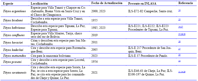 Tabla 1, se presenta la lista actualizada de especies de Tityus para Bolivia, el nombre de la especie, los autores que citaron o describieron, en territorio boliviano y posteriormente las muestras presentes en la colección de INLASA con su respectivo código.