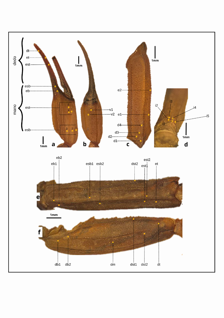 Pedipalpos. Los pedipalpos tienen la tibia esencialmente oval y alargada, con mayor protuberancia antes del comienzo del dedo fijo. Los dedos fijos como móviles son delgados y largos con una leve curvatura hacia la parte dorsal (medidas morfométricas en Tabla 1).