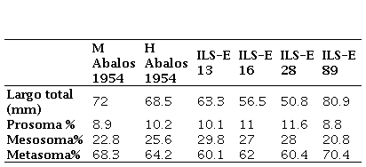 Morfométricamente la muestra ILS-E 89 procedente de Rurrenabaque se acerca más a los valores de la descripción original de Abalos1, variando en un 2 % a favor del largo del metasoma como en contra del mesosoma. Por otro lado, las muestras ILS-E 13, ILS-E 16 y ILS-E 28 procedentes de Trincheron pese a ser machos se parecen a los valores morfométricos de la hembra T. proseni alótipo, pero con las siguientes diferencias: ILS-E 13 tiene un mesosoma alargado (4 %) pero un metasoma más corto (4 %); ILS-E 16 posee un prosoma y mesosoma ligeramente alargados en un 1 % y un metasoma ligeramente reducido (2 %), ILS-E 28 presenta un prosoma ligeramente alargado (1 %) un metasoma alargado (3 %) y un metasoma reducido (4 %). Tabla 2.