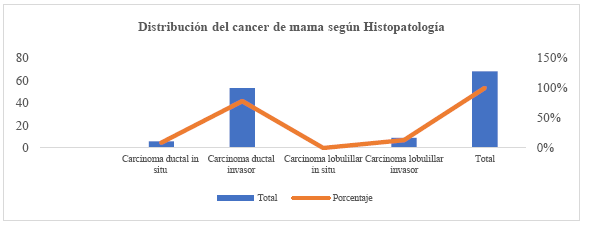 En este estudio se notó una gran variabilidad y heterogeneidad en los diferentes tumores lo que les otorga un pronóstico y enfoque terapéutico diferente. El carcinoma ductal invasivo fue el tumor maligno de mama más frecuente según histopatología. El segundo más observado fue el carcinoma lobulillar invasor, el tercero en frecuencia el carcinoma ductal in situ y no se presentaron otros tipos de CM.