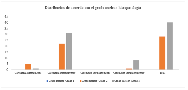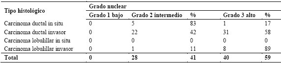 Se evidencia que las pacientes con carcinoma ductal in situ en su gran mayoría tuvieron grado nuclear 2, en el carcinoma ductal invasor tuvieron grado 2 y grado 3 casi equitativamente y en el carcinoma lobulillar invasor la mayoría de las pacientes tuvo grado nuclear 3, lo que indica que existen diferencias en los grados nucleares según el tipo histopatológico. En nuestro estudio se observó que, en todas las pacientes con diagnóstico de CM no hubo ningún caso de grado nuclear 1 (bajo), observándose un predominio para grado nuclear 3 (alto) representando el 59 % del total de las pacientes y el grado nuclear (intermedio), representando el 41 % de pacientes. Esto indicaría que la mayoría de los tumores malignos de mama son de grado alto e intermedio y significa que las células observadas fueron en su mayoría grandes con cromatina irregular con múltiples nucleolos prominentes, con mitosis frecuentes y usualmente no polarizados hacia el espacio luminal32. La clasificación histopatológica21,33 y el grado nuclear también difirieron significativamente entre los subtipos de CM21,33.