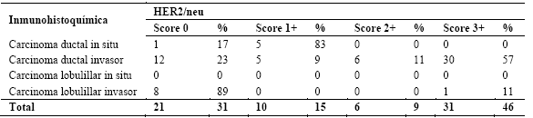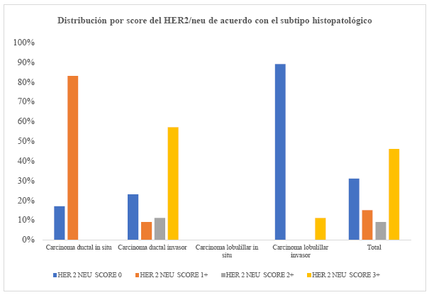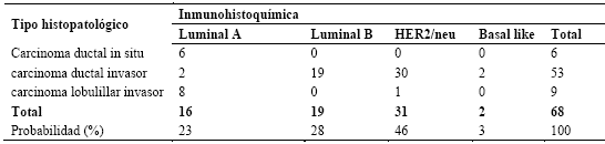 El carcinoma ductal in situ y el carcinoma lobulillar en su gran mayoría fueron del subtipo molecular luminal A y el carcinoma ductal invasivo tuvo el subtipo molecular HER2/neu sobre expresado en su gran mayoría.