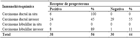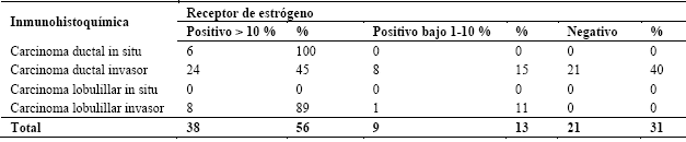 En los CM receptores hormonales positivos representan el 70-80 % de todos los CM, estos cánceres dependientes de hormonas a menudo se pueden tratar con éxito con una variedad de medicamentos que modulan al receptor de estrógeno o reducen el estrógeno, en esta investigación el subtipo molecular con receptores positivos estuvo presente en el 100 % de pacientes con diagnóstico de carcinoma ductal in situ y el 89 % de carcinoma lobulillar invasor, lo que señala que estos tipos de tumores tiene un mejor pronostico, responderán mejor a la terapia antihormonal y concuerda con los datos obtenidos en la literatura mundial en la que comprenden un alto porcentaje y un mejor pronostico, no obstante las pacientes con los subtipos de CM con receptor hormonal único positivo (ER+PR- y ER-PR+) tienen más probabilidades de tener características desfavorables y peor supervivencia que el subtipo ER+PR+ y deben considerarse clínicamente distintos a estos22-24.
