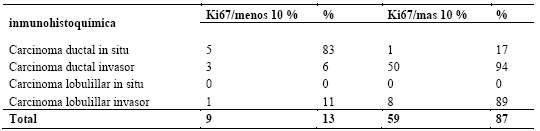 Existe una asociación significativa entre la clasificación y los niveles de Ki6734, los carcinomas bien diferenciados, exhibieron niveles predominantemente bajos de Ki67, los carcinomas intermedios y pobremente diferenciados refieren niveles más altos de Ki67 con un rango más amplio34. En el estudio realizado el carcinoma ductal invasor, la mayoría de las pacientes tuvieron Ki67 > al 10 % lo que indica que este tumor tiene un alto nivel de proliferación celular, respecto al carcinoma ductal in situ la mayoría de pacientes tuvieron Ki67< 10 %, lo que señala que este tumor tiene un bajo nivel de proliferación celular, el carcinoma lobulillar invasor en su gran mayoría tuvo Ki67 >10 %, lo que indica que al igual que el carcinoma ductal invasor es un tumor de proliferación celular alta.