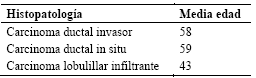 En un estudio realizado por Kwon et al.21, en un total de 284 pacientes, observaron que, la clasificación histopatológica identificó carcinoma ductal invasivo 242 casos, carcinoma lobulillar invasivo 16 casos y otros (carcinoma con características medulares 4 casos, carcinoma con diferenciación neuroendocrina 1, carcinoma microinvasivo 2, carcinoma papilar 8, carcinoma cribiforme 1, carcinoma metaplásico 3, carcinoma mucinoso 8, y (carcinoma tubular 4)21. En nuestro estudio el tipo histológico más frecuente también fue el carcinoma ductal invasor, seguido del carcinoma lobulillar invasivo y finalmente el carcinoma ductal in situ, pero no se identificó en el grupo de estudio otros tipos histológicos de CM.