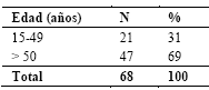 El grupo etario de mujeres > 50 años, tuvieron el mayor porcentaje con diagnóstico de CM, representando el 69 % en comparación con las pacientes de 15 a 49 años que ocupo el 31 %, señala que el grupo etario donde se presenta mayormente el CM es en las mujeres mayores a 50 años30,31, no obstante, en este estudio se presentó el caso de carcinoma ductal infiltrante moderadamente diferenciado en una adolescente de 16 años.