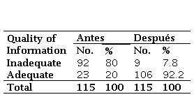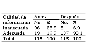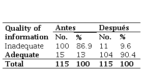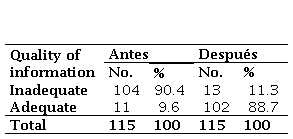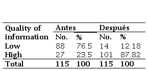 A significant value was obtained in the McNemar test for a degree of freedom, (p<0.05) which validates the favorable modification of the quality of information in this aspect achieved by the participants.