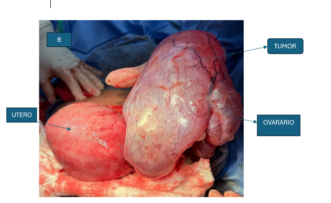 Se visualiza útero post gestante en transquirúrgico de cesárea, con exposición total del tumor de ovario izquierdo muy vascularizado que mide aproximadamente 22 x 17 cm de diámetro