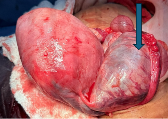 A post-pregnant uterus was visualized in a transsurgical cesarean section with partial exposure of the highly vascularized left ovarian tumor