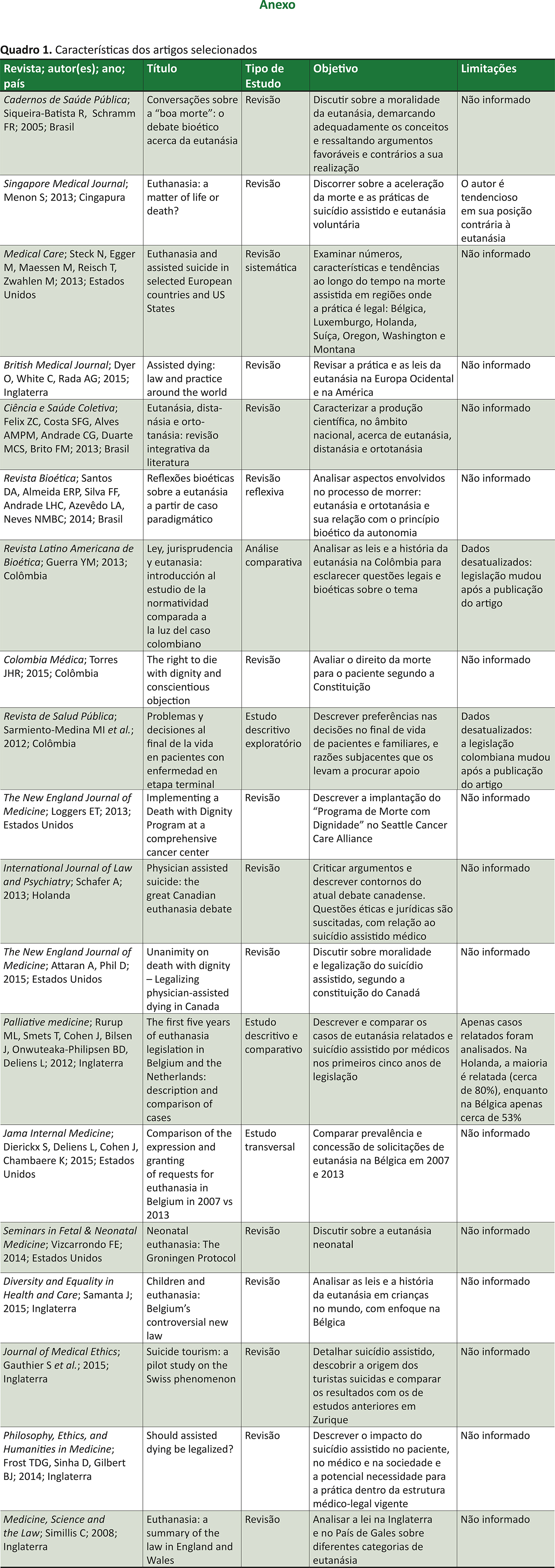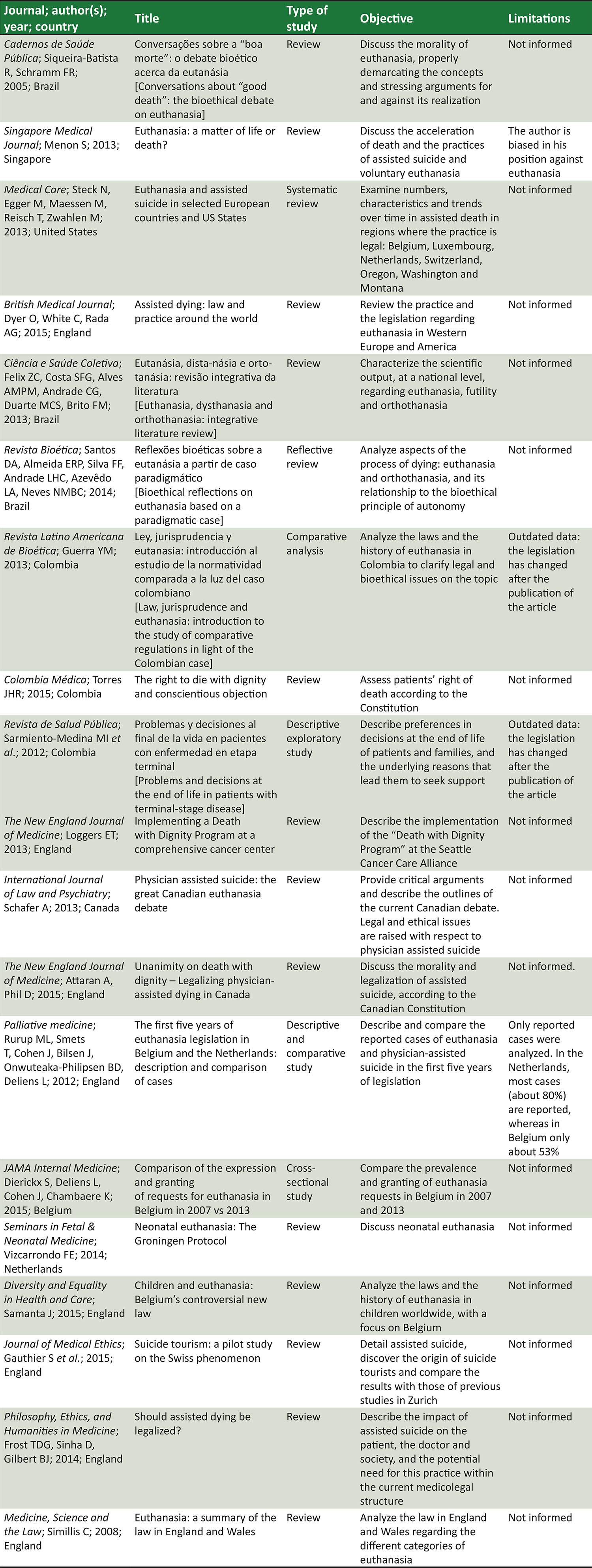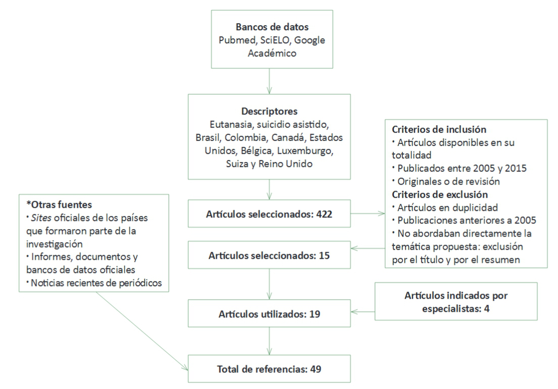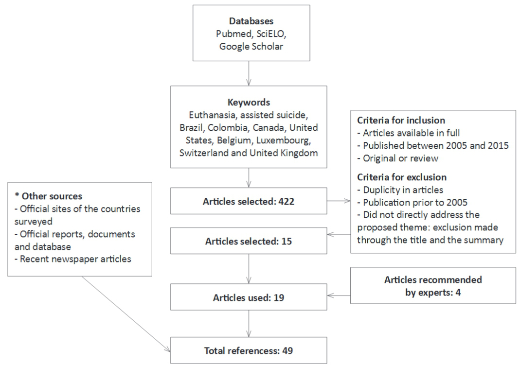 Este trabalho consiste em revisão sistemática da literatura. Os descritores utilizados para a pesquisa foram, em inglês e português: “eutanásia”, “suicídio assistido”, “Holanda”, “Bélgica”, “Luxemburgo”, “Suíça”, “Reino Unido”, “Brasil”, “Colômbia”, “Canadá” e “Estados Unidos”. Para identificar as publicações que compuseram este estudo, realizou-se busca online nos bancos de dados Scientific Electronic Library Online (SciELO), National Center for Biotechnology Information (PubMed) e Google Acadêmico. Para auxiliar a busca e a categorização dos artigos, foi utilizada a ferramenta MeSH.