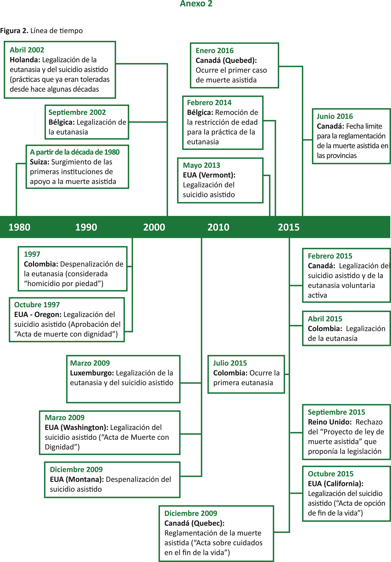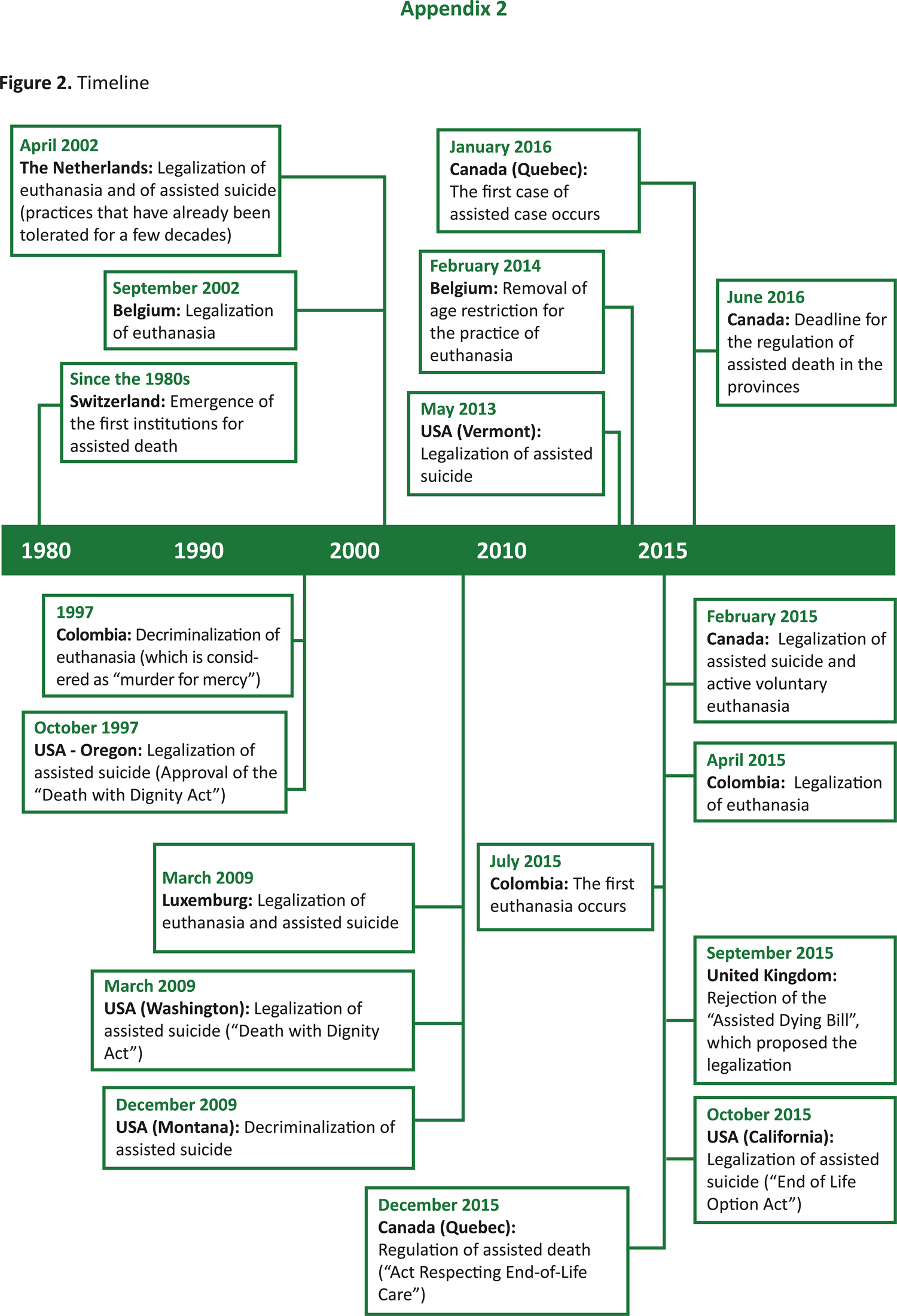 A morte assistida é permitida em quatro países da Europa Ocidental: Holanda, Bélgica, Luxemburgo e Suíça; em dois países norte-americanos: Canadá e Estados Unidos, nos estados do Oregon, Washington, Montana e Vermont; e, na América do Sul, na Colômbia 4. As leis e critérios adotados para a realização dessa prática diferem entre si em cada um desses países. Explicitar a forma como a morte assistida ocorre nesses locais e comparar sua legislação à de outros países semelhantes em aspectos socioeconômico-culturais, permite compreender melhor o assunto, e serve de base para futuros debates 2. A situação do Brasil e do Reino Unido foi abordada ao final do trabalho com o objetivo de contrastar a posição dos demais países e enriquecer a discussão. Para facilitar a compreensão, a linha do tempo com os principais marcos da morte assistida no mundo é apresentada no Anexo 2.