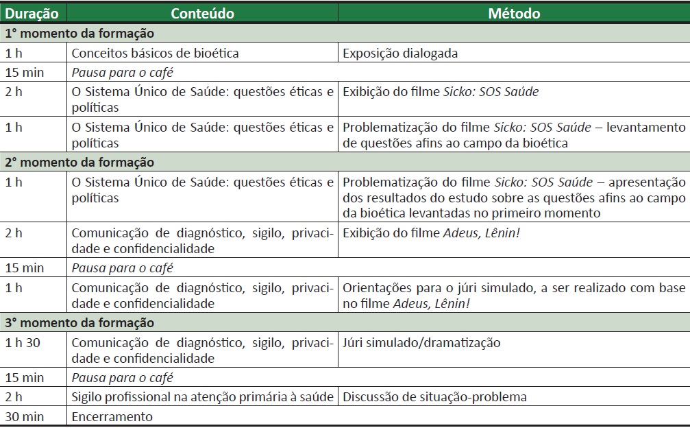 O projeto de pesquisa foi desenvolvido em três momentos. A primeira etapa consistiu em estudo com abordagens quantitativa e qualitativa, com participação de 73 profissionais de 15 equipes da ESF, obtendo-se resultados interessantes, como a baixa percepção e identificação de problemas bioéticos pelos membros das equipes14. A categorização dos problemas percebidos permitiu a divisão em cinco grandes grupos, relacionados: 1) à desigualdade de acesso a serviços de saúde; 2) à relação ensino-trabalho-comunidade; 3) a sigilo e confidencialidade; 4) a conflitos entre equipe e usuários; e 5) a conflitos entre membros da equipe14.