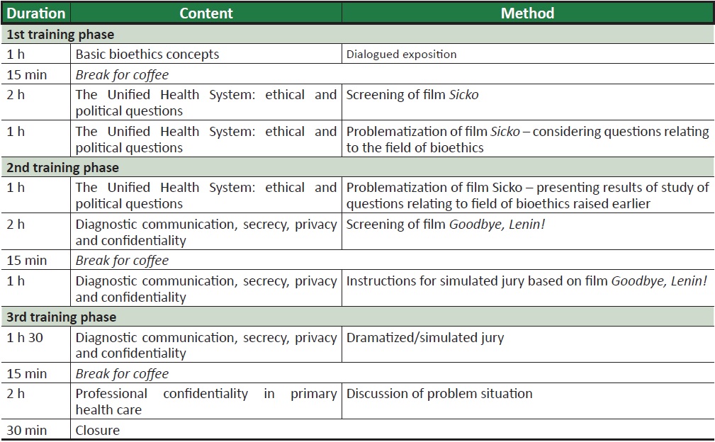A fim de evitar vieses, utilizou-se, com todos os grupos, o mesmo roteiro condutor, constituído pelas seguintes questões: 1) O que vocês entendem por ética?; 2) O que vocês entendem por bioética?; 3) Como devem ser resolvidos os problemas bioéticos que ocorrem na ESF?; 4) O que vocês acharam da oficina de formação em ética e bioética?; 5) Vocês pensam que as discussões realizadas na oficina de formação poderão ser úteis para a abordagem dos problemas bioéticos que ocorrem na ESF?