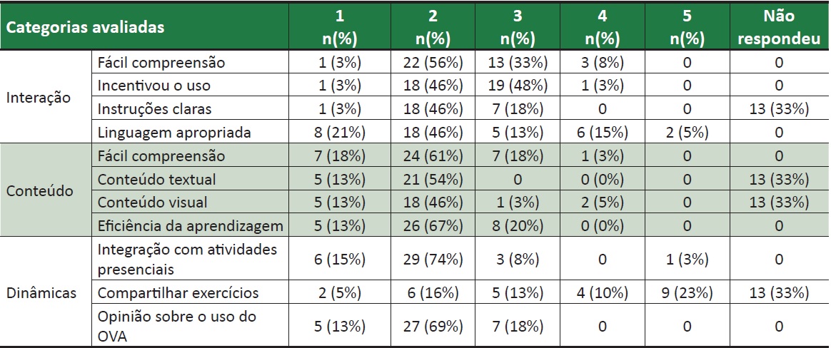 A terceira categoria do OVA avaliada relaciona-se ao modo como foi utilizado pedagogicamente, tendo em vista que teve o objetivo de apoiar a disciplina presencial de bioética. Os resultados quantitativos podem ser observados no Quadro 1.