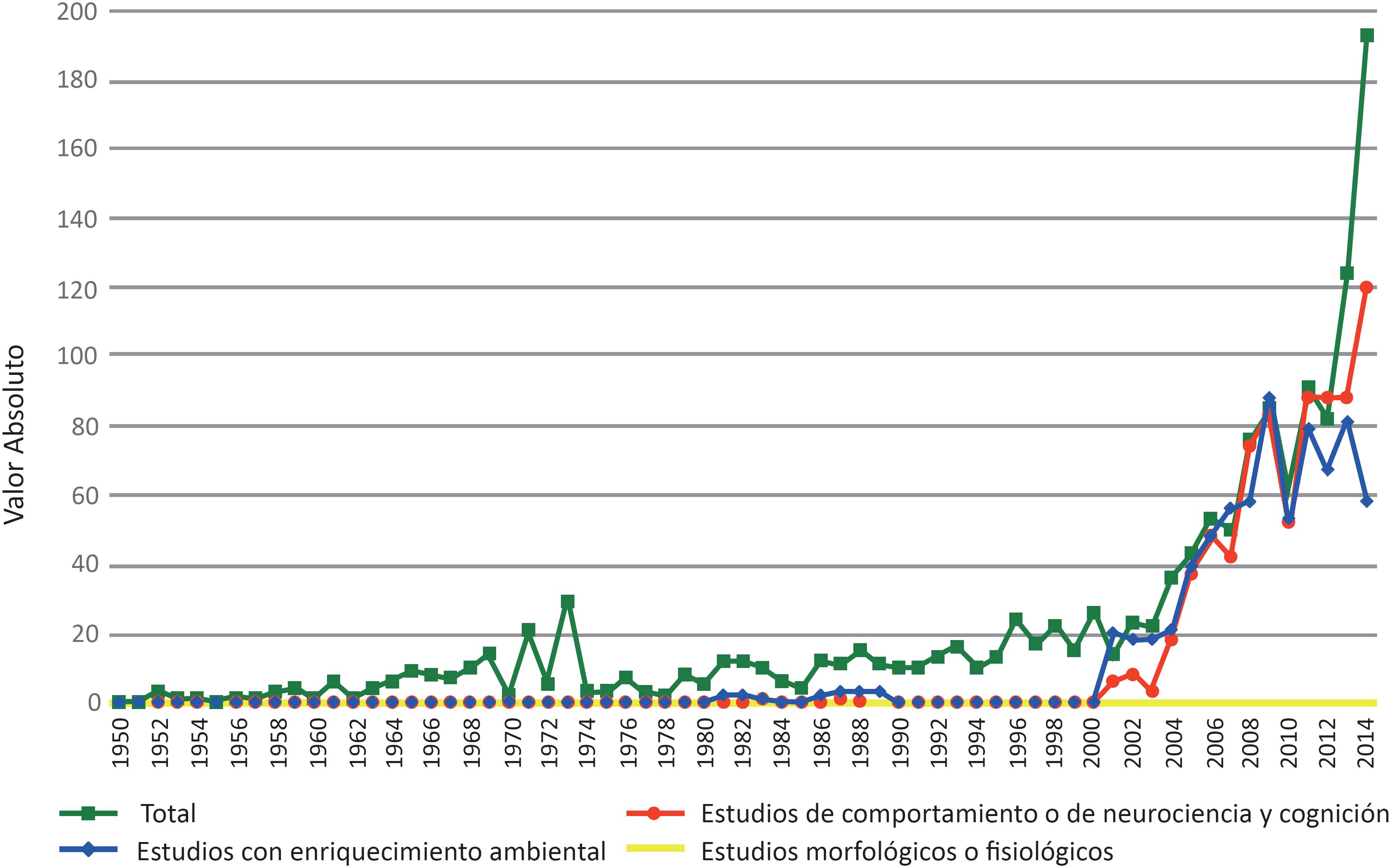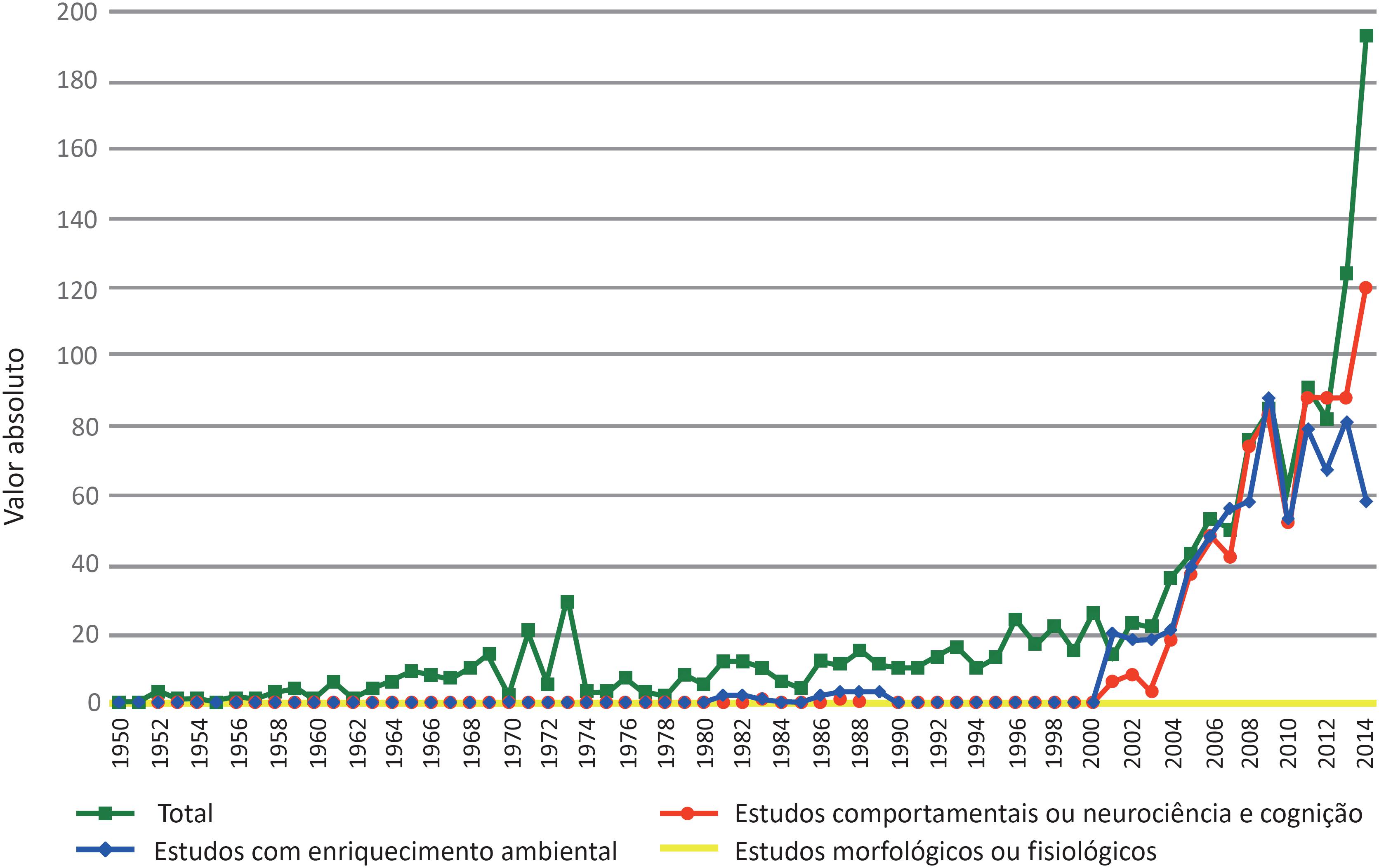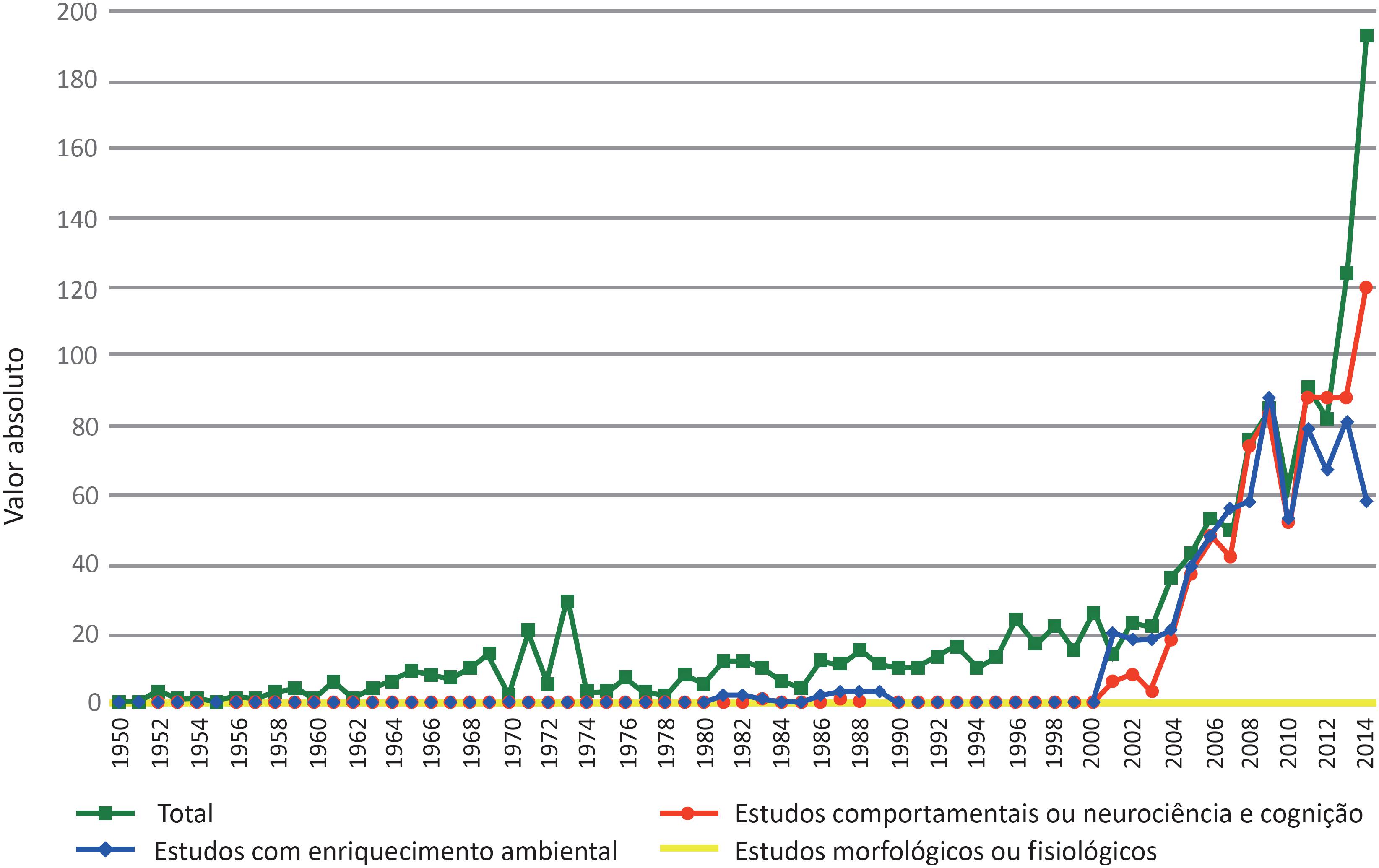 Os textos científicos revisados indicaram crescimento que localiza o primeiro texto à década de 1950, e o pico de produção, em 2014. Estudos que utilizam especificamente enriquecimento ambiental e associação da técnica com as neurociências começam a surgir no cenário científico a partir dos anos 2000, acompanhando nos anos sequentes o aumento da produção científica observada para o total (Figura 1).