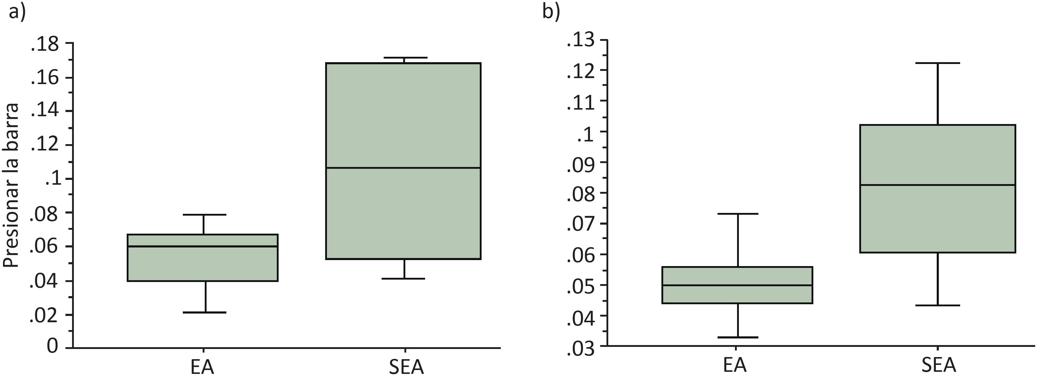 Após o animal estar condicionado ao estímulo de pressão à barra, exercício de extinção da resposta de pressão à barra (E) foi realizado. Esse teste tem como objetivo observar o efeito sobre a frequência do comportamento de pressionar a barra sem a presença do reforço. O processo foi encerrado depois de já ter ocorrido o mínimo de cinquenta respostas e o animal permanecer 10 minutos sem pressionar a barra 12.
