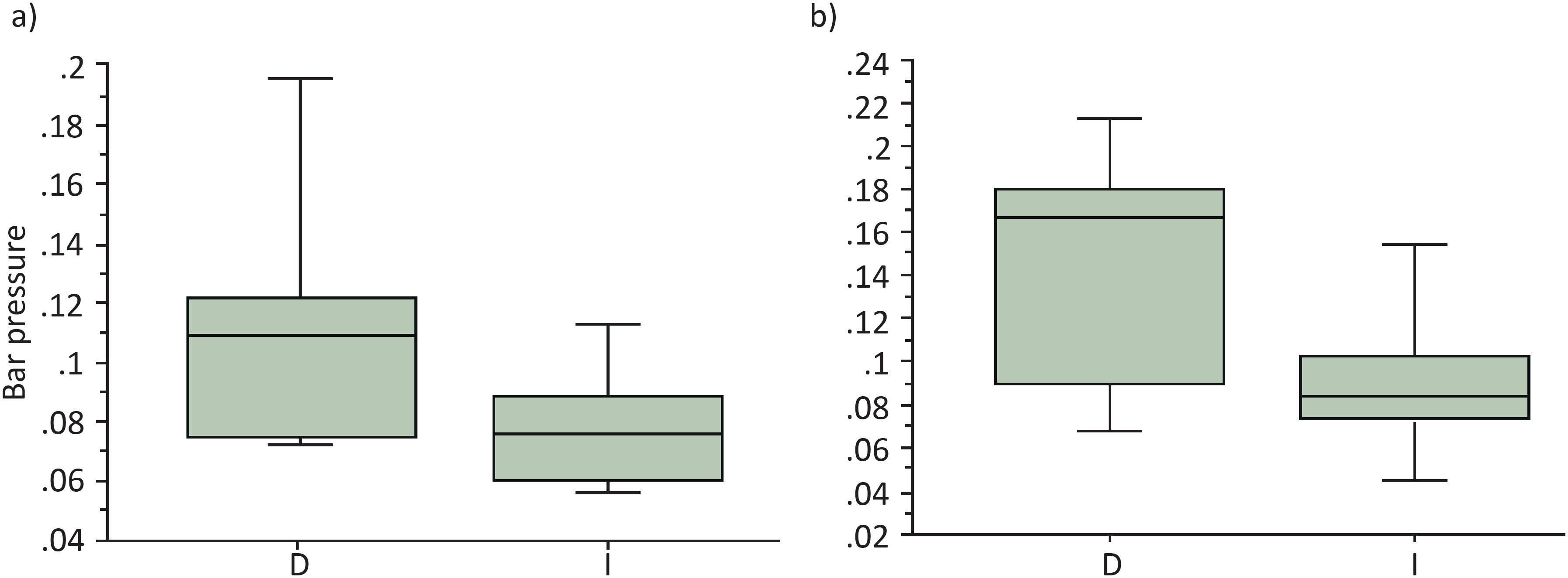 Não houve diferença no desempenho do processo de aprendizagem entre indivíduos dominantes e subordinados em nenhum dos testes aplicados, mesmo considerando o estímulo dos ambientes com e sem EA. Sendo assim, foi possível comparar duplas, como um todo, com indivíduos isolados. Verificou-se diferença do desempenho de aprendizagem entre duplas e isolados no teste de extinção de reforço intermitente (p = 0,043), sem influência do EA. Os indivíduos isolados obtiveram melhor desempenho e maior homogeneidade na resposta de pressão à barra no teste (Figura 3). Não houve diferença significativa entre duplas e isolados para os demais testes realizados.