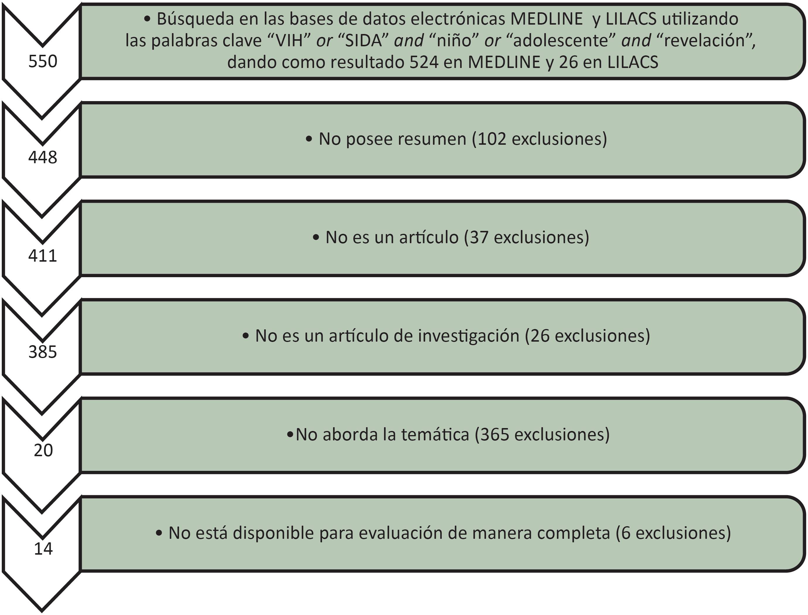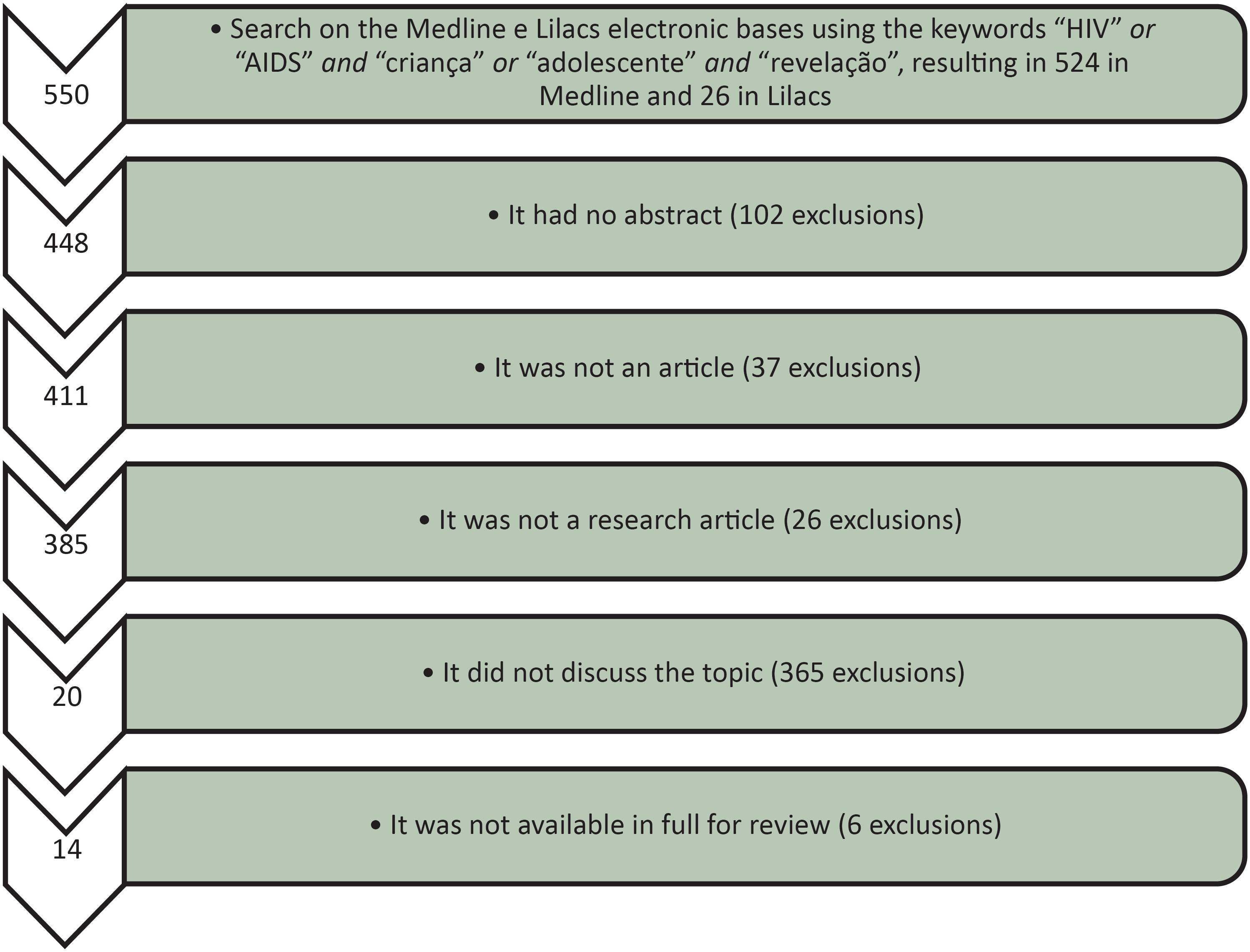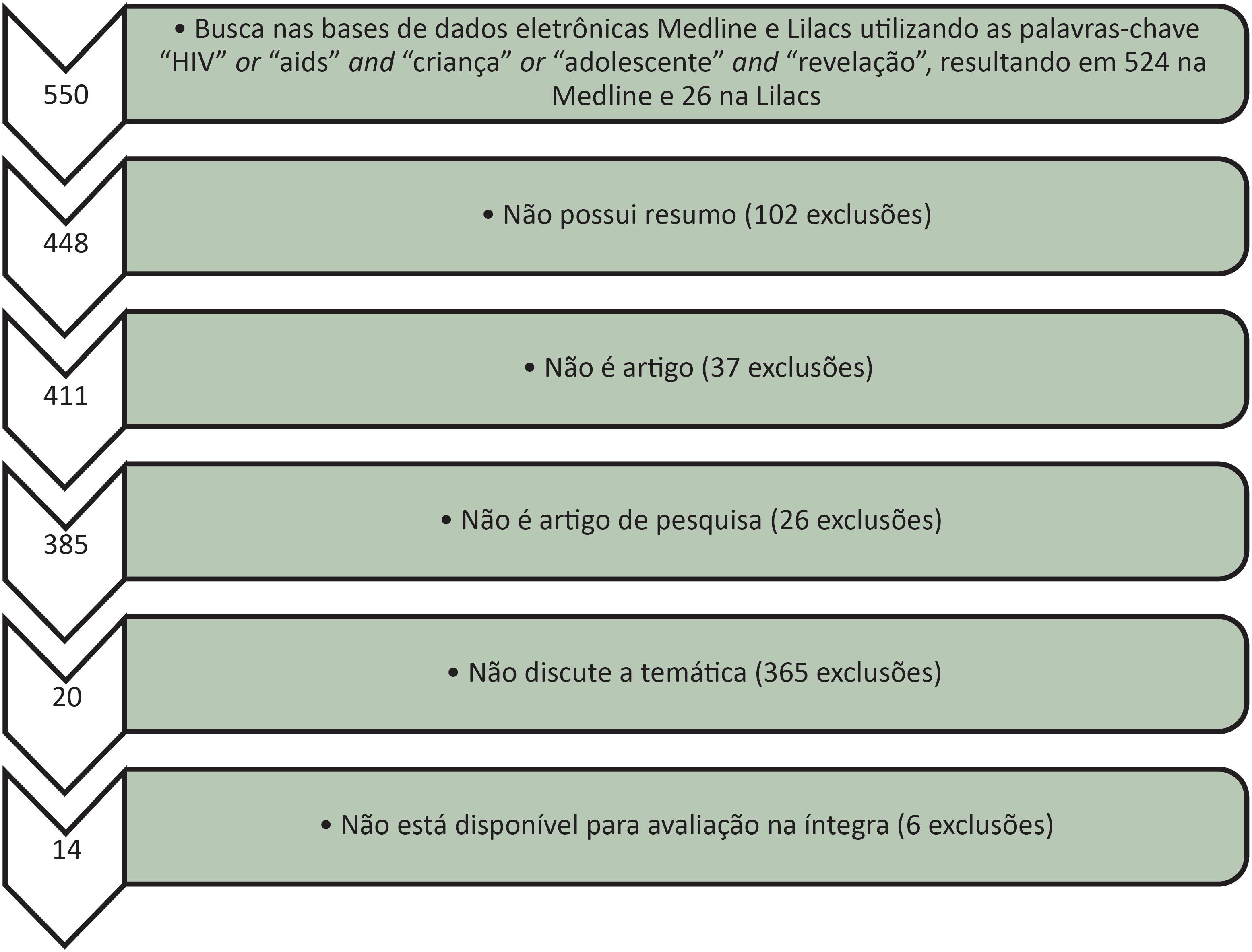 A busca foi empreendida em março de 2015. Para selecionar o corpus foram utilizados os seguintes critérios de inclusão: resumos disponíveis na base de dados; artigos de pesquisa; temática da revelação do diagnóstico de HIV dos pais para os filhos; artigos disponíveis on-line e gratuitamente na íntegra; idiomas português, inglês ou espanhol. Com a intenção de captar o maior número de artigos possível que respondessem à questão de pesquisa, não foi estabelecido recorte temporal. Entre as 550 publicações científicas identificadas nas bases de dados, 14 foram selecionadas, conforme o fluxograma de inclusão (Figura 1).