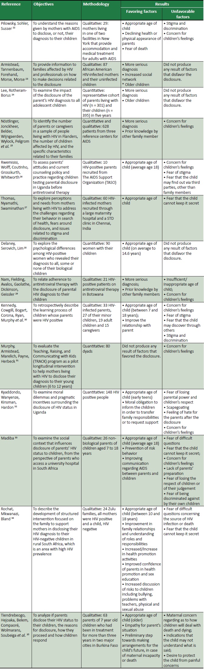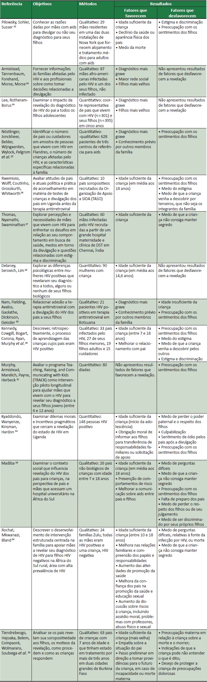 Como evidências científicas para os fatores que interferem na decisão de revelar o diagnóstico de HIV dos pais para os filhos, identificaram-se: capacidade cognitiva e maturidade da criança; fortalecimento dos laços familiares; informações para a criança acerca da doença; adoecimento e morte dos pais; descoberta por terceiros; estigma e preconceito; reações negativas das crianças; modo de falar da doença com a criança; e medo de perder o poder parental22–35 (Quadro 1, anexo).