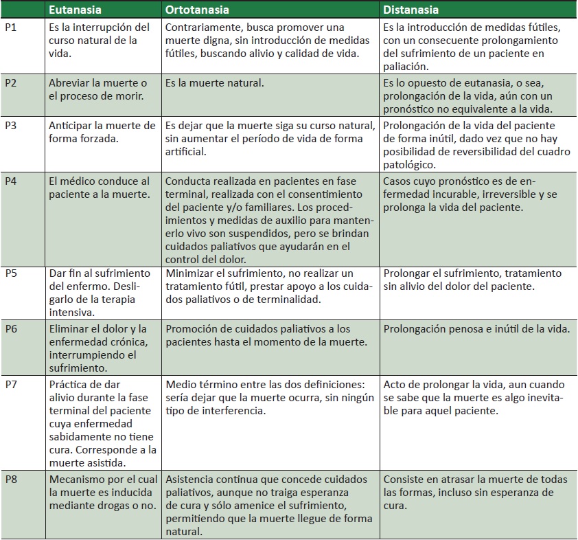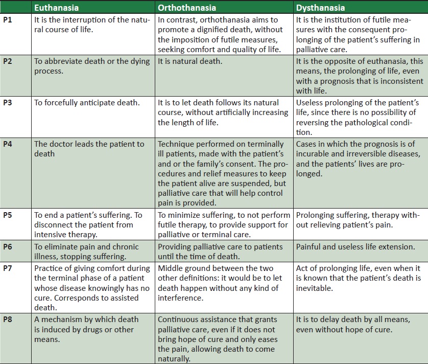 A participante P7 define eutanásia como “morte assistida”, o que nos permite pensar que ela tenha associando essa ideia à de suicídio assistido. No entanto, para alguns autores5, existem diferenças entre esses conceitos, sendo a eutanásia tratada como ato no qual o profissional põe termo à vida de pessoa acometida por doença incurável, ao passo que o suicídio assistido ocorre quando a pessoa solicita a ajuda de outra para, de fato, provocar sua morte, caso não seja capaz de executar essa ação.