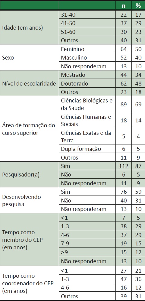 A Tabela 1 apresenta as respostas mais frequentes sobre o perfil dos coordenadores. Nela, é possível constatar predomínio profissional nas áreas de Ciências Biológicas e da Saúde, prevalência de mestres, doutores e pesquisadores em exercício oriundos de instituições de ensino superior, e faixa etária predominando entre 40 e 60 anos. Quando se associa idade, nível de escolaridade e experiência como pesquisador, infere-se que são pessoas profissionalmente maduras e qualificadas para o exercício de atividades de pesquisa. A concentração em Ciências Biológicas e da Saúde é tendência identificada em estudos similares 17-20.