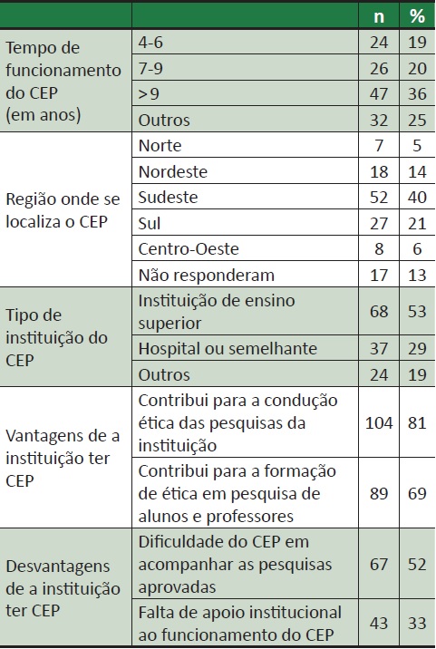 A Tabela 2 expõe as características dos CEP mais apontadas pelos coordenadores. Mais da metade dos comitês de ética (53%) localizava-se em instituições de ensino superior, o que pode explicar, pelo menos em parte, o grau de formação acadêmica e o perfil de pesquisador da maioria dos coordenadores. Esse também é dado importante, pois assinala que pertencem a instituições estratégicas, já que são responsáveis pela maior parte das pesquisas realizadas no país. Agrega-se a isso a possibilidade do cumprimento do papel educativo dos CEP para com pesquisadores em formação, como é o caso dos alunos dessas instituições.