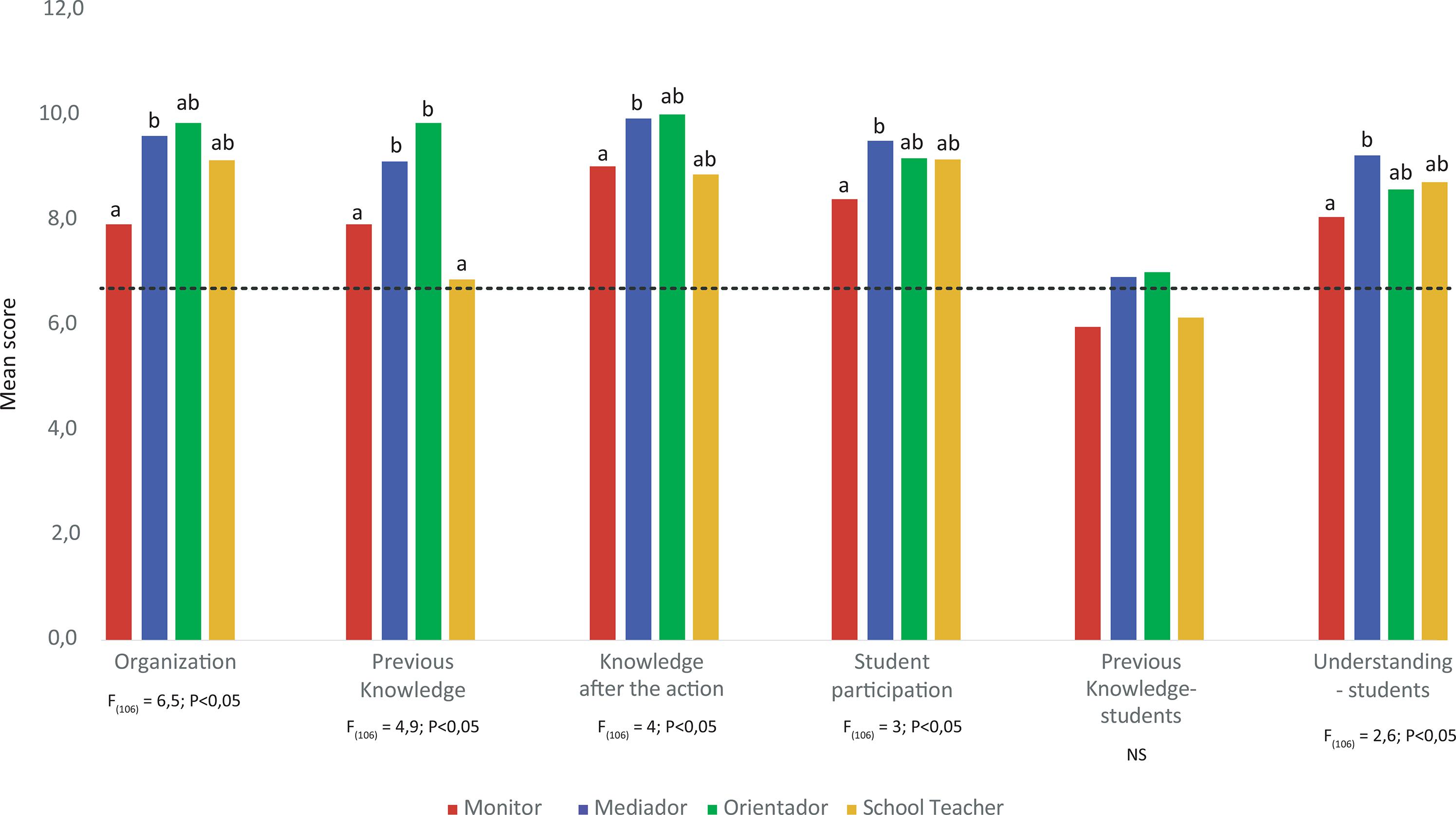 O instrumento apresentava opções de atribuição de valores de 1 a 10 para avaliação de tópicos como: organização, orientadores, mediadores, monitores, participação dos estudantes, autoavaliação quanto a conhecimentos prévios e pós-ação, e importância da ação, na formação profissional e pessoal, bem como o relato dos pontos considerados positivos e negativos na ação.