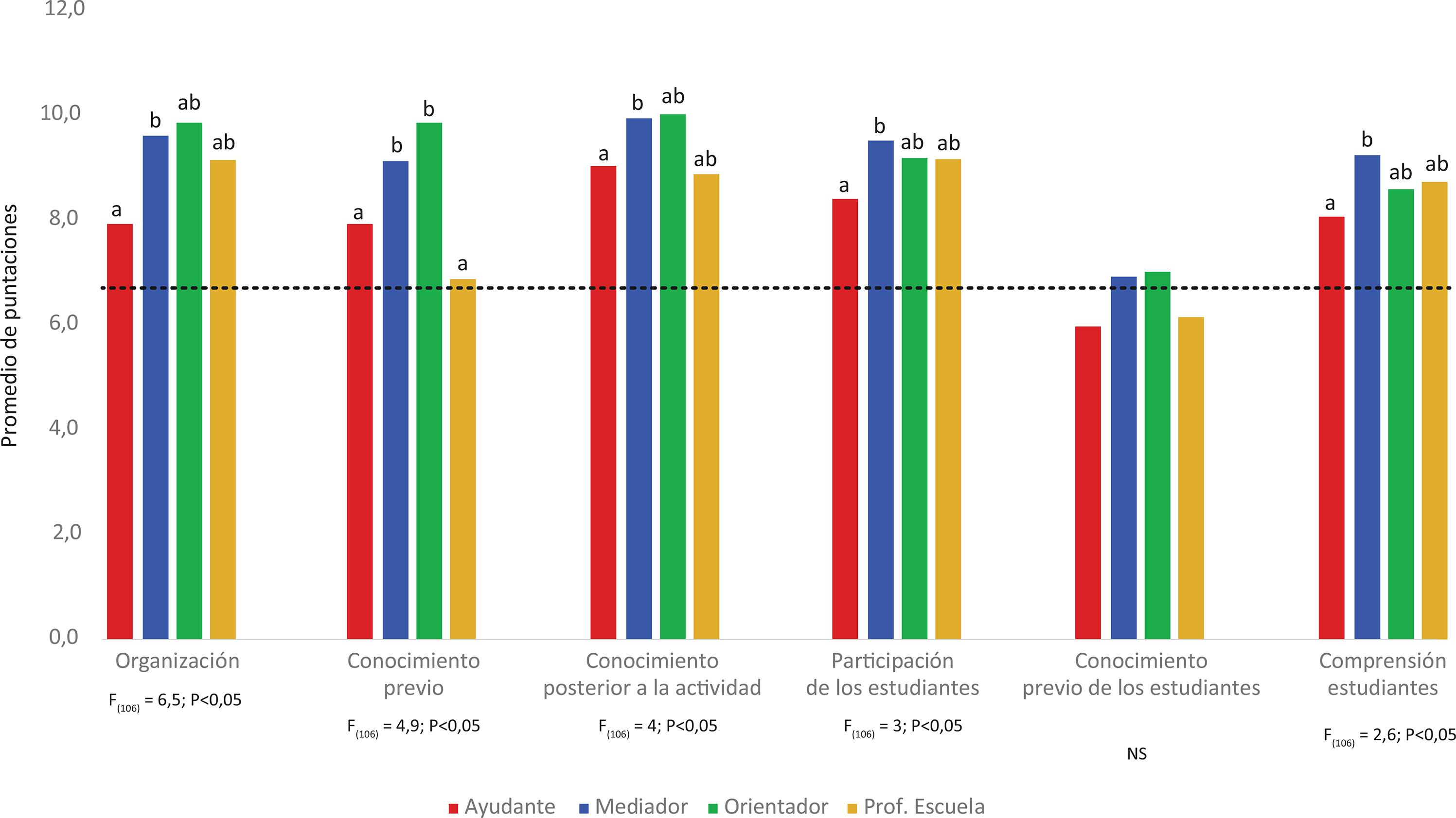 Os respondentes do instrumento de avaliação (8 orientadores, 30 mediadores, 67 monitores e 8 professores das escolas participantes) apresentaram atribuição de valores superiores a 8,0, semelhantes nos itens de avaliação da: 1) avaliação geral, 2) organização; participação de 3) orientadores; 4) mediadores; 5) monitores e; 6) professores de escola. Destacou-se discrepância quanto à menor atribuição de valor para os itens “avaliação da organização” e “participação e contribuição dos estudantes” pelo grupo dos monitores. Na autoavaliação, os monitores e professores das escolas, quando comparados com orientadores e mediadores, atribuíram baixos valores para compreensão prévia de bioética, porém com subsequente aumento do conhecimento após a participação nas atividades. A avaliação sobre os estudantes pelos quatro grupos pesquisados mostrou que consideravam baixo conhecimento prévio sobre a bioética; no entanto, classificavam a participação e compreensão da proposta pelos alunos como alta (Gráfico 1).