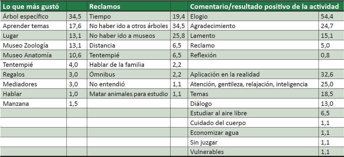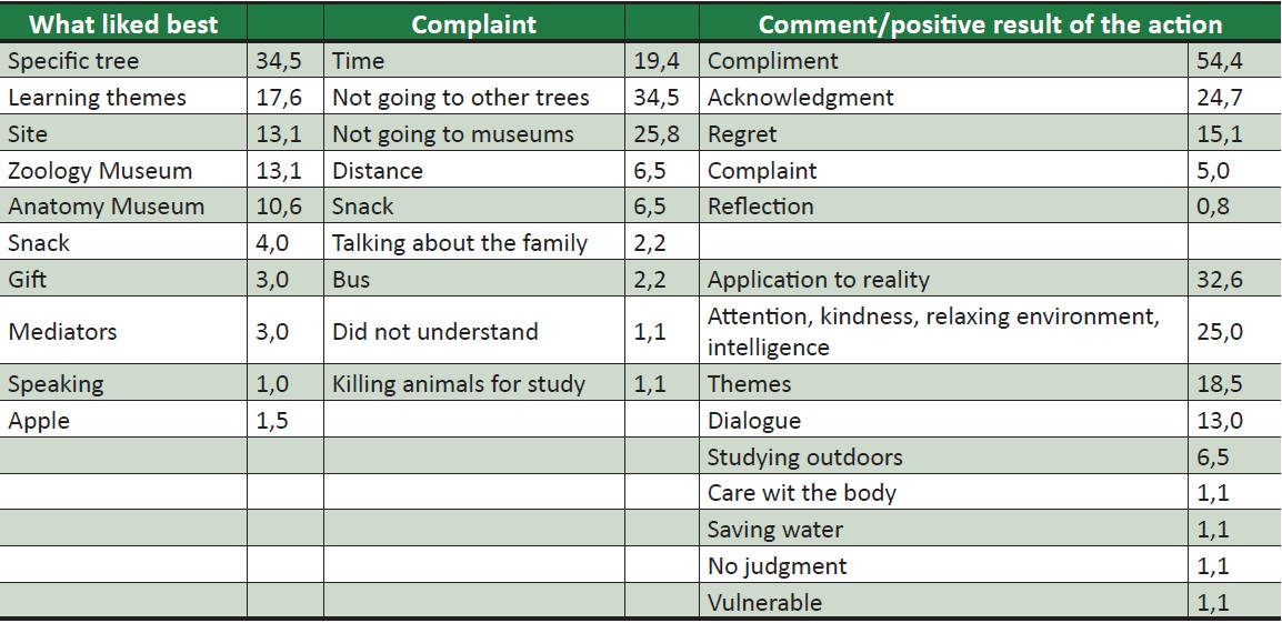 Na Tabela 1, estão as frequências de respostas relativas ao questionamento sobre o que mais gostaram da ação, as reclamações, o tipo de comentário e o resultado positivo da ação. Quanto ao que mais gostaram, a principal referência foi à árvore específica da qual participaram. Contudo destacaram como positivo aprender mais sobre temas presentes no cotidiano, referindo-se à oportunidade de dialogar, ter sido ouvido sem julgamentos, considerando que a atividade parecia “estar entre amigos”. Gostaram igualmente do lugar, elogiando a estrutura e a beleza, tendo uma delas frisado ter sido o melhor passeio da vida; para muitos, era a primeira vez que visitavam uma universidade e confessaram que gostariam de voltar como universitários. Também destacaram as visitas aos museus de zoologia e anatomia, sendo baixa a frequência de menção ao lanche e ao brinde.