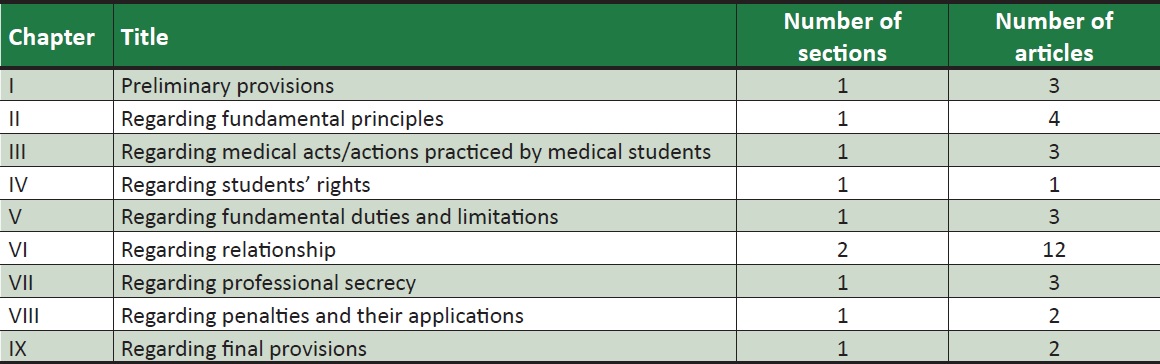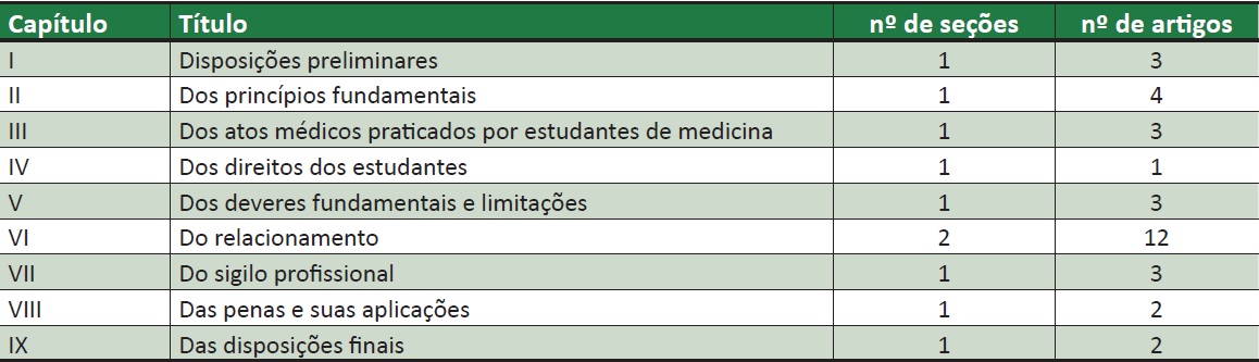 Os itens selecionados foram então categorizados pelo grau de importância na formação ética em medicina, sucedendo aos títulos dos capítulos do código. Posteriormente, estruturaram-se os artigos para composição dos capítulos. Após sua elaboração, o código foi apreciado e revisto de forma independente por dois docentes, doutores do curso médico, que apresentaram suas considerações em reunião com o grupo.