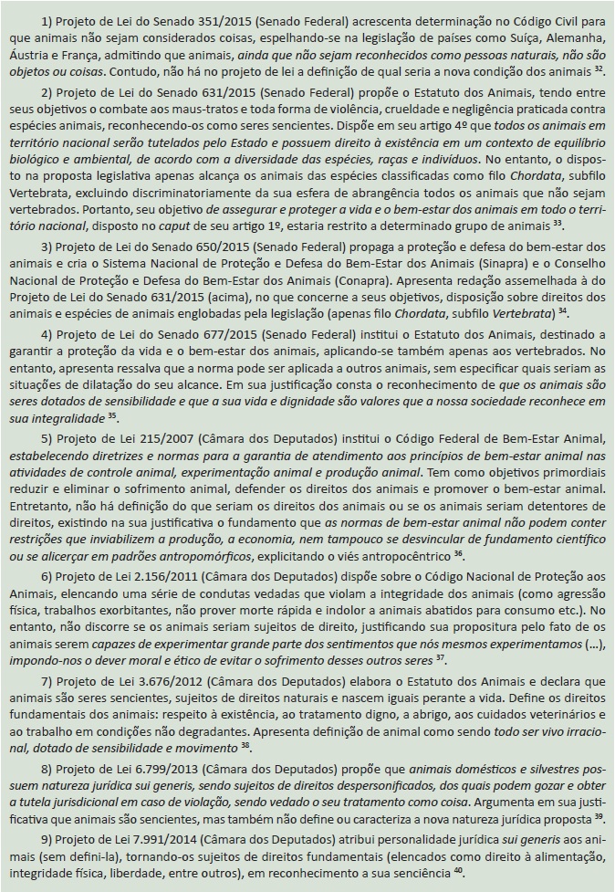 A alteração da condição de objeto dos animais resulta na declaração de que não são coisas ou na estipulação de situação ímpar, sem haver definição precisa de qual seria o novo enquadramento desses seres vivos no ordenamento jurídico. Percebe-se que mesmo proposições legislativas que pretendem atribuir direitos basilares aos animais ou alterar sua situação jurídica não entram na seara de definir esses conceitos. Isso demonstra que esses próprios conceitos podem gerar debate permanente 42, razão pela qual não foram explicitamente enfrentados pelos congressistas propositores, havendo rol dos direitos básicos dos animais em apenas dois projetos de lei.