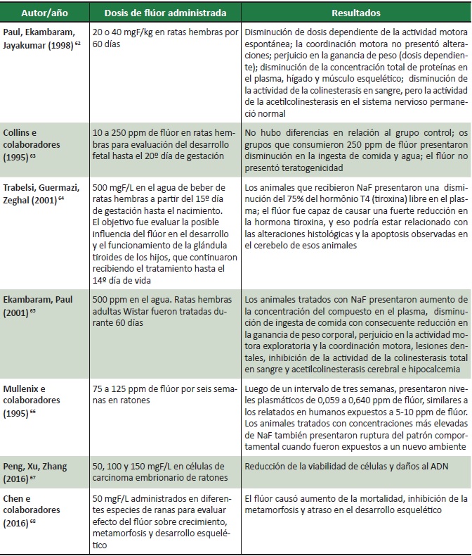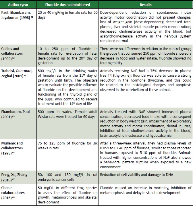 Investigações dos possíveis malefícios da exposição sistêmica ao flúor não se limitam à fluorose dentária. Há estudos na literatura científica que correlacionam intoxicação por flúor com efeitos neurotóxicos, perda da atividade motora normal, aumento de resistência à insulina, hipotireoidismo, alterações ósseas, como osteosclerose, osteoporose, entre outras patologias 24,25. Essas pesquisas apresentam resultados que comprovam que o flúor é nocivo para a saúde. Entretanto, as concentrações de fluoreto utilizadas em seus métodos muito ultrapassam os teores recomendados para a fluoretação das águas, ou seja, nenhum desses estudos pode concluir que o método pode causar as patologias citadas.