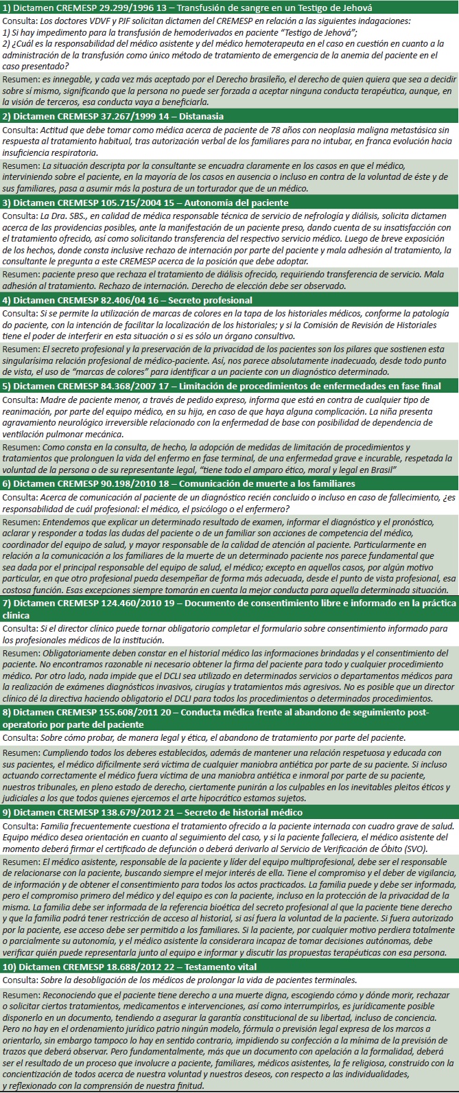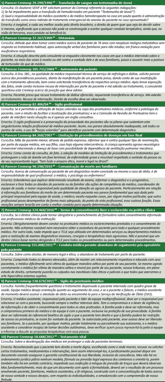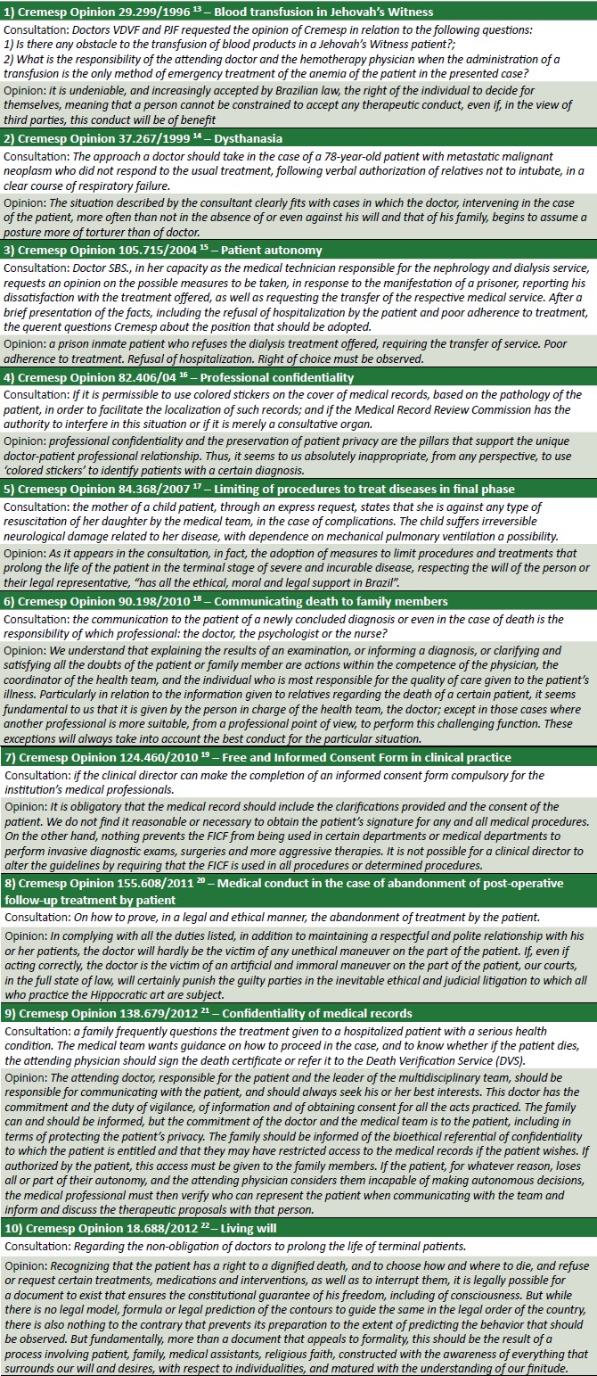 Entre os 30 pareceres-consultas da amostra, classificados como “bioéticos”, foram selecionados pelo primeiro autor os seguintes documentos, em ordem cronológica de publicação, levando-se em consideração valor histórico, abrangência doutrinária para o tema em questão ou possível influência nas resoluções publicadas pelo CFM e na atualização do CEM vigente: 1) Parecer Cremesp 29.299/1996 13 – transfusão de sangue em testemunha de Jeová; 2) Parecer Cremesp 37.267/1999 14 – distanásia; 3) Parecer Cremesp 105.715/2004 15– autonomia do paciente; 4) Parecer Cremesp 82.406/2004 16 – sigilo profissional; 5) Parecer Cremesp 84.368/2007 17– limitação de procedimentos de doenças em fase final; 6) Parecer Cremesp 90.198/2010 18 – comunicação de morte aos familiares; 7) Parecer Cremesp 124.460/2010 19 – termo de consentimento livre e esclarecido na prática clínica; 8) Parecer Cremesp 155.608/2011 20 – conduta médica no abandono de seguimento pós-operatório pelo paciente; 9) Parecer Cremesp 138.679/2012 21 – sigilo do prontuário médico; 10) Parecer Cremesp 18.688/2012 22 – testamento vital. Ao final pode-se consultar anexo com a descrição de cada parecer.