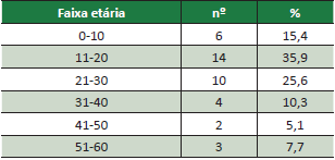 Identificou-se que no período entre 2007 e 2013 foram abertos 636 processos judiciais para aquisição de medicamentos e insumos relacionados ao DM. Destes, 39 (6,2%) foram para bombas de insulina. A faixa etária predominante foi entre 11 e 20 anos (35,9%), como mostra a Tabela 1, e a maioria dos pleitos foi efetivada por homens (72,5%).