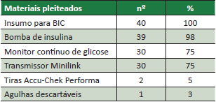 Além das solicitações para fornecimento de bombas de insulina, foi possível identificar o pleito de outros insumos, como medicamentos e materiais. Dentre os medicamentos estão as insulinas Lispro e Aspart (Tabela 3).