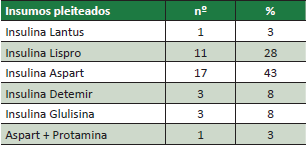 Outro dado significativo deste estudo é a ocorrência de grandes demandas para obter medicamentos como Insulina Lispro (28%) e Aspart (43%), caracterizadas como insulinas ultrarrápidas, com início de efeito e concentração intensificados e duração de ação mais curta. Em estudo anterior, verificou-se bom controle glicêmico com o uso dessas substâncias, além de redução dos eventos hipoglicêmicos 27.