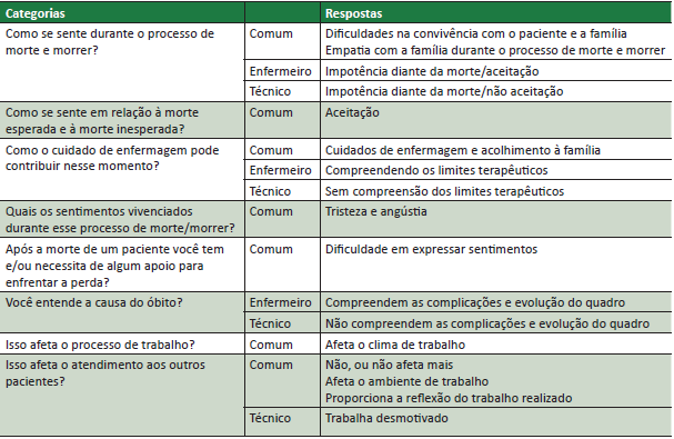 As respostas dos participantes evidenciaram como os profissionais de enfermagem se sentem durante o processo de morte e morrer e foram divididas em quatro subcategorias. Quanto a dificuldades na convivência com paciente e família, empatia e sentimento de impotência, não houve diferença nos discursos entre enfermeiros e técnicos. Já quanto à impotência seguida da aceitação da morte ou não, houve divergência entre os discursos de técnicos e enfermeiros.