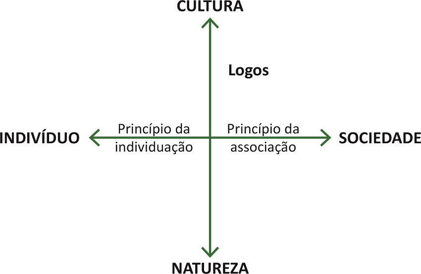 A partir desse pressuposto, o ordenamento teórico-conceitual pode ser estabelecido situando os conceitos nos eixos ortogonais, que representam polaridades básicas delineadoras da condição humana. O eixo horizontal representa a dimensão relacional entre o individual e o universal, ou entre o uno e o múltiplo. Nesse eixo assume papel fundamental a polaridade indivíduo-sociedade e seus conaturais princípios da autoteleologia e da heteroteleologia, que podem ser traduzidos, respectivamente, como “individuação” e “associação”. O princípio da individuação diz respeito ao estabelecimento de valores e metas de ação pelos entes individuais modelados, enquanto o princípio da associação pode ser entendido tanto como material (relações de troca) quanto psíquico (comunicação ou intersubjetividade).