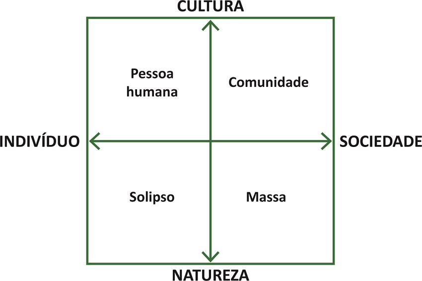 Embora esses espaços no plano possam albergar os diversos conceitos e categorias usuais da ética e antropologia filosófica, destacamos quatro categorias paradigmáticas, cada uma em seus respectivos quadrantes (Figura 2): 1) no superior esquerdo, o conceito de pessoa humana, que constitui síntese dos conceitos “indivíduo” e “cultura”; 2) no superior direito, o conceito de comunidade, constituindo síntese dos conceitos “sociedade” e “cultura”; 3) no inferior direito, o conceito de massa, síntese dos conceitos “sociedade” e “natureza”; e 4) no inferior esquerdo, o conceito de solipso, como síntese dos conceitos “indivíduo” e “natureza”.