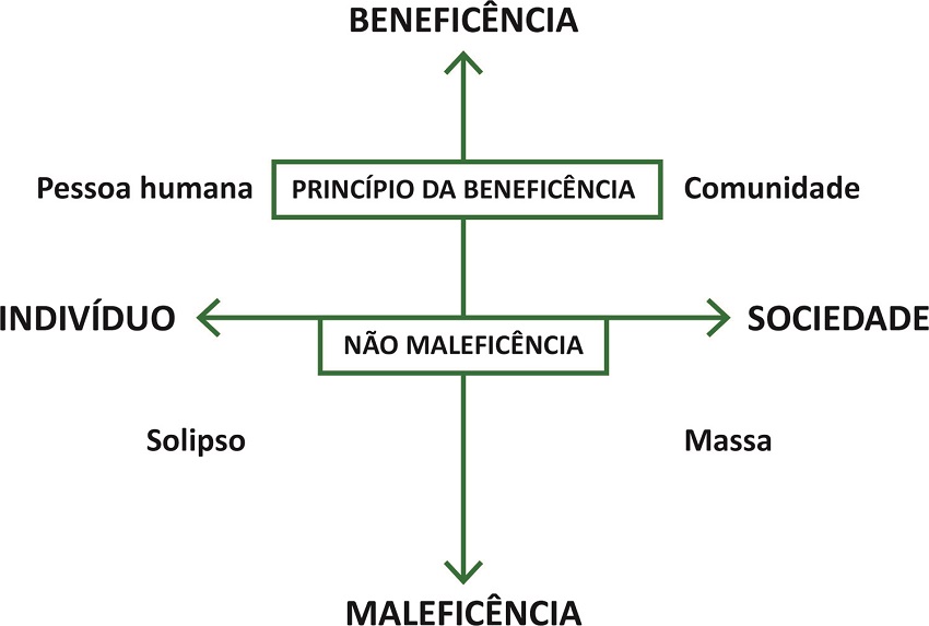 Dessa forma, na Figura 3 observamos que o princípio da beneficência e o princípio da não maleficência devem ser situados no eixo vertical. É no polo ascendente, direcionado pelo logos, que o princípio da beneficência encontra o seu lugar; pelo princípio da oposição, situa-se, no polo oposto, a maleficência.