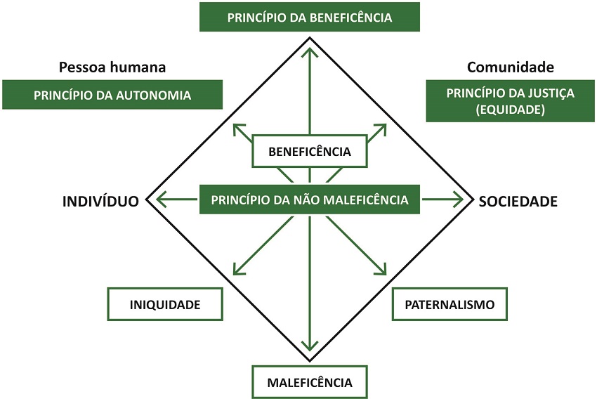 O referido isomorfismo permite nomear a última figura como quadrado lógico principialista, pois inclui os opostos e contraditórios dos princípios da beneficência, da justiça (equidade) e da autonomia, que são, respectivamente, a maleficência, a iniquidade e o paternalismo. Como antiprincípios, estão logicamente situados no plano inferior do diagrama em espécie de analítica vetorial. Por exemplo, fica evidente que a iniquidade e o paternalismo, em síntese, induzem a maleficência.