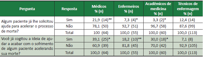 O número de participantes que já recebeu o pedido de ajuda para acelerar o processo de morte de algum paciente foi 39 (11%), sendo que 315 (89%) nunca receberam esse pedido. Nas respostas dos grupos profissionais com mais de 50 participantes, encontrou-se que 14 (21,9%) médicos, 4 (7,3%) enfermeiros, 14 (12,4%) técnicos de enfermagem e 2 (3,3%) acadêmicos de medicina já receberam esse pedido. Houve diferença estatisticamente significante (p<0,05) nas respostas “sim” dos técnicos de enfermagem quando comparadas com as dos acadêmicos de medicina, médicos e enfermeiros; e entre as dos médicos e acadêmicos de medicina (Tabela 1).