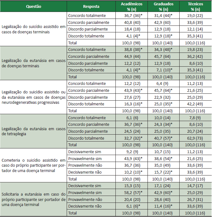Sobre a concordância com a criação de uma lei no Brasil que permita o suicídio assistido em casos de doenças terminais, 102 (28,8%) concordaram totalmente; 139 (39,3%) concordaram parcialmente; 50 (14,1%) discordaram parcialmente; e 63 (17,8%) discordaram totalmente. Nos grandes grupos, 76 (77,6%) acadêmicos, 104 (74,3%) profissionais graduados e 61 (52,6%) profissionais técnicos concordaram com a legalização do suicídio assistido em casos de doenças terminais. Houve diferença estatisticamente significante (p<0,05) nas respostas “concordo totalmente” e “discordo totalmente” dos técnicos em relação aos acadêmicos e graduados (Tabela 2).