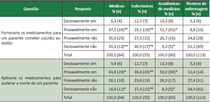 Quando questionados se forneceriam os medicamentos para um paciente cometer suicídio assistido, caso uma lei fosse aprovada no Brasil, 30 (8,5%) responderam “decisivamente sim”, 99 (28%) “provavelmente sim”, 100 (28,2%) “provavelmente não” e 125 (35,3%) “decisivamente não”. Nas respostas dos grupos profissionais com mais de 50 participantes, encontrou-se que 39 (65%) acadêmicos de medicina, 28 (43,8%) médicos, 23 (41,8%) enfermeiros e 16 (14,2%) técnicos de enfermagem dariam os medicamentos para um paciente cometer suicídio assistido.