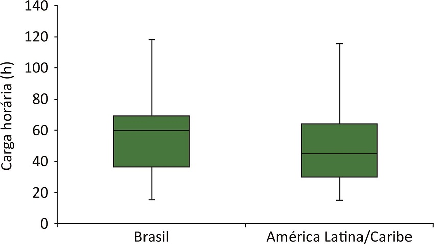 Quanto à carga horária total, constatou-se que as escolas brasileiras têm maior carga horária total (mediana: 8.520 versus mediana: 3.675 horas), segundo o teste de Mann-Whitney. Contudo, embora se verifique tendência de maior carga horária para essas disciplinas no Brasil, os dados não foram estatisticamente significantes (teste de Mann-Whitney, p=0,10, Figura 1).