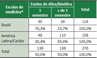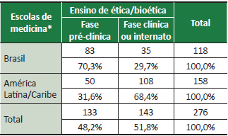 A análise referente à alocação das disciplinas de ética e bioética nas escolas de medicina da América Latina e do Caribe evidenciou que, das 517 escolas, 241 apresentavam dados incompletos em seus sites ou o curso distribuído em módulos, sem informações sobre a oferta destas disciplinas, ou ainda as 68 escolas que não informam se essas disciplinas fazem parte de sua grade curricular. Com efeito, foram incluídos neste estudo os dados completos de 276, das quais 118 escolas de medicina são do Brasil e 158, internacionais (América Latina e a Caribe).