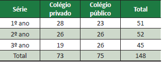 Participaram do estudo 148 alunos, metade de cada sexo, distribuídos conforme Tabela 1. Do total de participantes, 14% tinham entre 14 e 15 anos, 48% entre 16 e 17 anos e 38%, 18 anos ou mais.