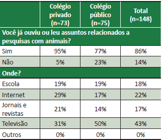 A maioria dos alunos pesquisados (86%) disse já ter ouvido falar ou lido sobre o uso de animais em pesquisas científicas (Tabela 2). Na escola pública houve mais alunos que responderam não ter conhecimento desses estudos (23%), quase cinco vezes mais do que na privada (5%). Os demais alunos indicaram o meio pelo qual obtiveram a informação, que de maneira geral ficou na seguinte ordem decrescente de citações: televisão, internet, escola, e jornais e revistas.