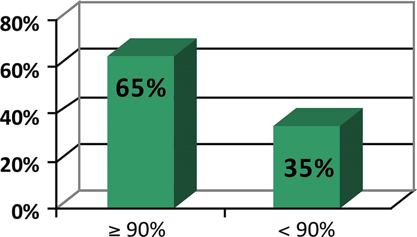 A média da velocidade de infusão para os pacientes foi de 41,55±6,85 mL/h, sendo que a quantidade de dieta infundida sofreu muitas alterações, como consequência principalmente das mudanças das formulações administradas e de suas densidades calóricas, para se atingir as necessidades nutricionais dos pacientes. No período da pesquisa evidenciou-se que, em média, o gasto energético total dos pacientes foi de 1.729±161,45 kcal/dia e o valor energético total ofertado em média foi inferior, alcançando 1.260,1±348,33 kcal/dia, incluindo a energia proveniente do soro glicosado. Assim, dos pacientes que completaram no mínimo quatro dias de recebimento da dieta enteral (n=20), 65% (n=13) alcançaram mais de 90% da adequação da dieta enteral no quarto dia de administração, como demonstra a Figura 1.